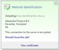 Per 3 maart 2014 verandert het beveiligingscertificaat van onze website http://www.alex-andre.nl. Op dit moment ontvangt u, wanneer u inlogt in uw administratie, een melding dat het beveiligingscertificaat van onze website niet vertrouwd wordt.