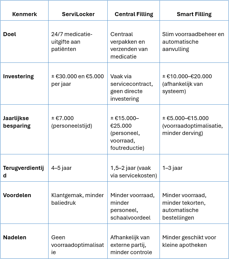 Op de Nederlandse markt zijn verschillende merken actief, waaronder Servilocker, BD Rowa™, Omnicell en Meditech. Welke oplossing passend is, hangt af van budget, de omvang van de apotheek en de mate waarin je wilt automatiseren. Let op: reken bij de vergelijking ook met jaarlijkse abonnementskosten voor service en onderhoud (vaak enkele duizenden euro’s).
